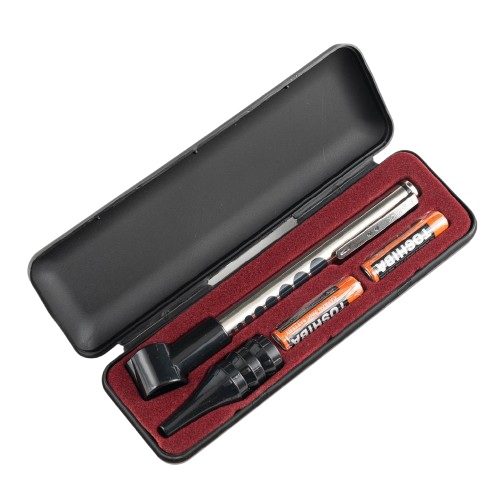 - Interruptor de contacto: activación rápida desde el clip, recomendado para exámenes pupilares.